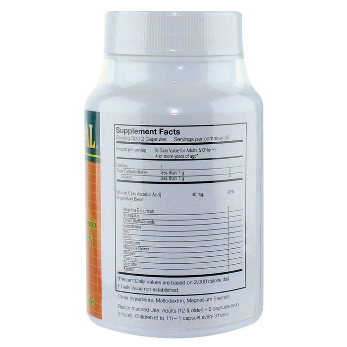 Please see the Supplement Facts tab for a full listing of the Ingredients in this product. In summary, it contains: Vitamin C (as Ascorbic Acid), Proprietary Blend (Angelica Dahuricae, Astragalus, Citrus Bioflavanoids, Ganoderma, Itex, Isatis, Ligusticum, Magnolia Flower, Moutan, Pueraria, Quercitin, Xanthii).